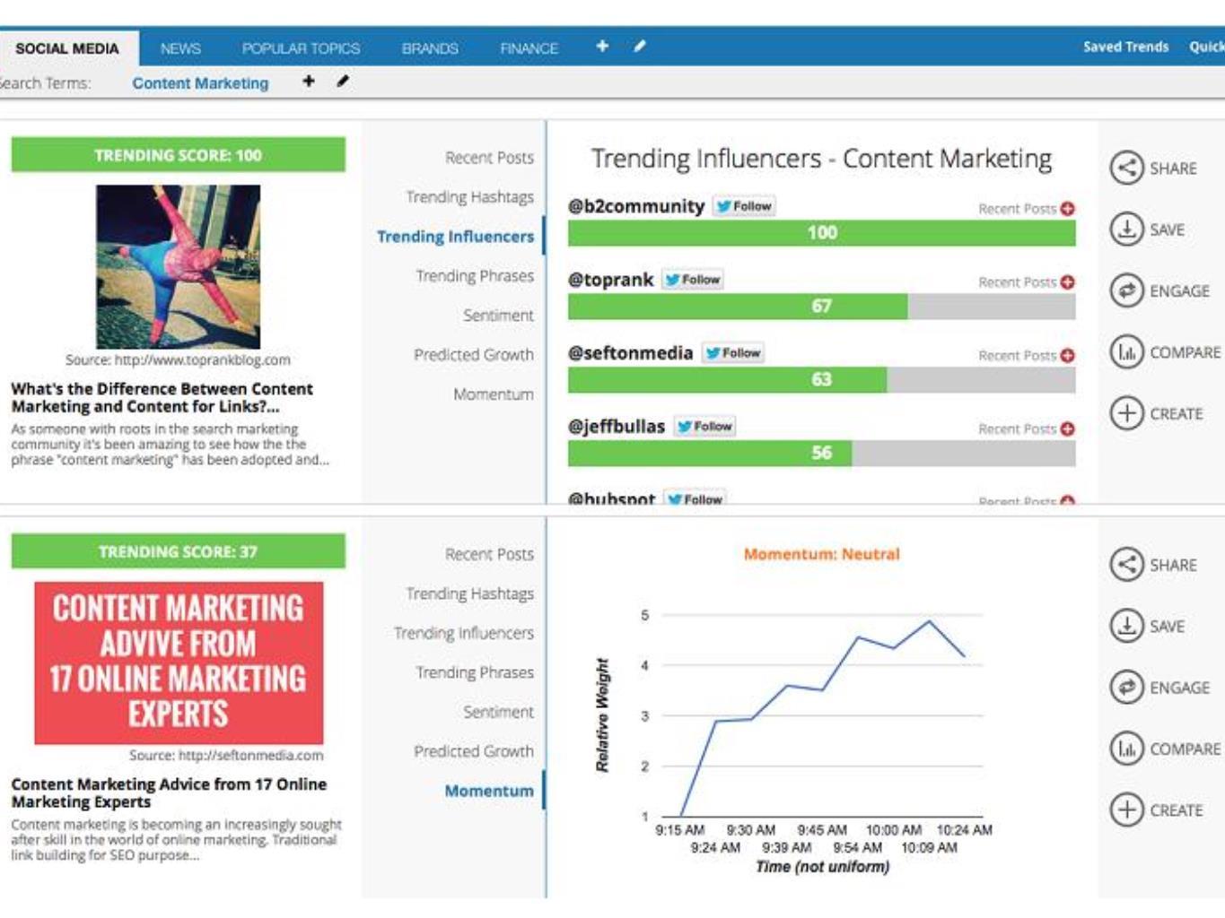 • BuzzSumo  قابلیت‌های زیادی در ایجاد محتوا و انتشار آن دارد. اگر شما در مرحله‌ی ایده‌پردازی هستید، می‌توانید با یک جستجوی ساده در این فضای آنلاین، با محتواهای مشابه که بیشترین سر و صدا را (از نقطه نظر میزان اشتراک‌گذاری و تعداد نظرات) راه انداخته‌اند، آشنا شوید.